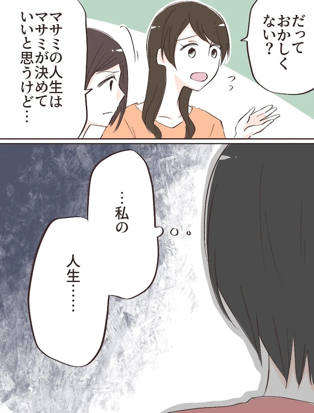 恋人のケイスケさんと暮らすマサミさんは、ある日弟のカズキさんから、母親への仕送りを少し増やして欲しいと言われます。なんでも、自分の息子を塾に行かせるために母親に援助を申し出ましたが、そうなると母親の生活費が圧迫されるため、姉であるマサミさんにその分を補填してほしいとのこと。当然、話を聞いたケイスケさんは混乱します。ところがマサミさんは幼少期から弟を支えるために自分の人生があると母親から言われて育っており、これは彼女にとって当たり前のことでした。思い返せば、マサミさんは幼い頃から「お姉ちゃんでしょ」と我慢させられてばかり。中学生の頃も、吹奏楽部に入りたいというマサミさんの希望を「カズキが中学受験するから無理」とバッサリ。高校に上がってからも、大学に進学したいと言うマサミさんの気持ちを聞くこともせず、はじめから就職させる気満々。社会人になってからも、お金は全て母親が管理。マサミさんは月1万円のお小遣いでなんとかやりくりするも、自分が稼いだお金を自由に使えないことに不満を感じるようになりました。そんな時、上司から思いがけない転勤の打診が。はじめは母親に反対されましたが、必死の説得によりマサミさんはついに家族から距離をとることに成功します。
