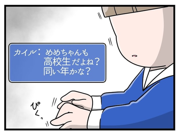 めいさんは、ゲーム内で友だちになった「カイル」と仲良くなり、ゲームよりも雑談をよくするようになります。カイルは「高校2年生」だとわかると、めいさんは中学生なのに「高1」だと嘘をついてしまいます。