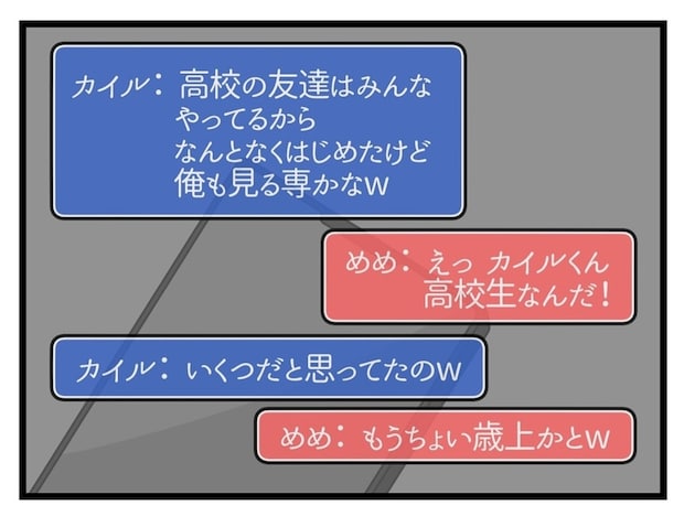 めいさんにとって「カイル」は、一緒にゲームをする友だちから、プライベートな話をする友だちに関係が変化しました。しかし、「カイル」の顔を知らないめいさん、さらに素性も知れない相手ということを理解しているのでしょうか…。