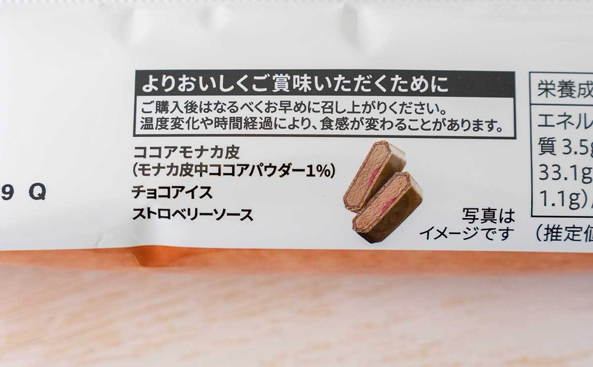 今回の新商品は、ストロベリーソースが入ったチョコレートアイスをココアモナカ皮で挟んだモナカアイスです。