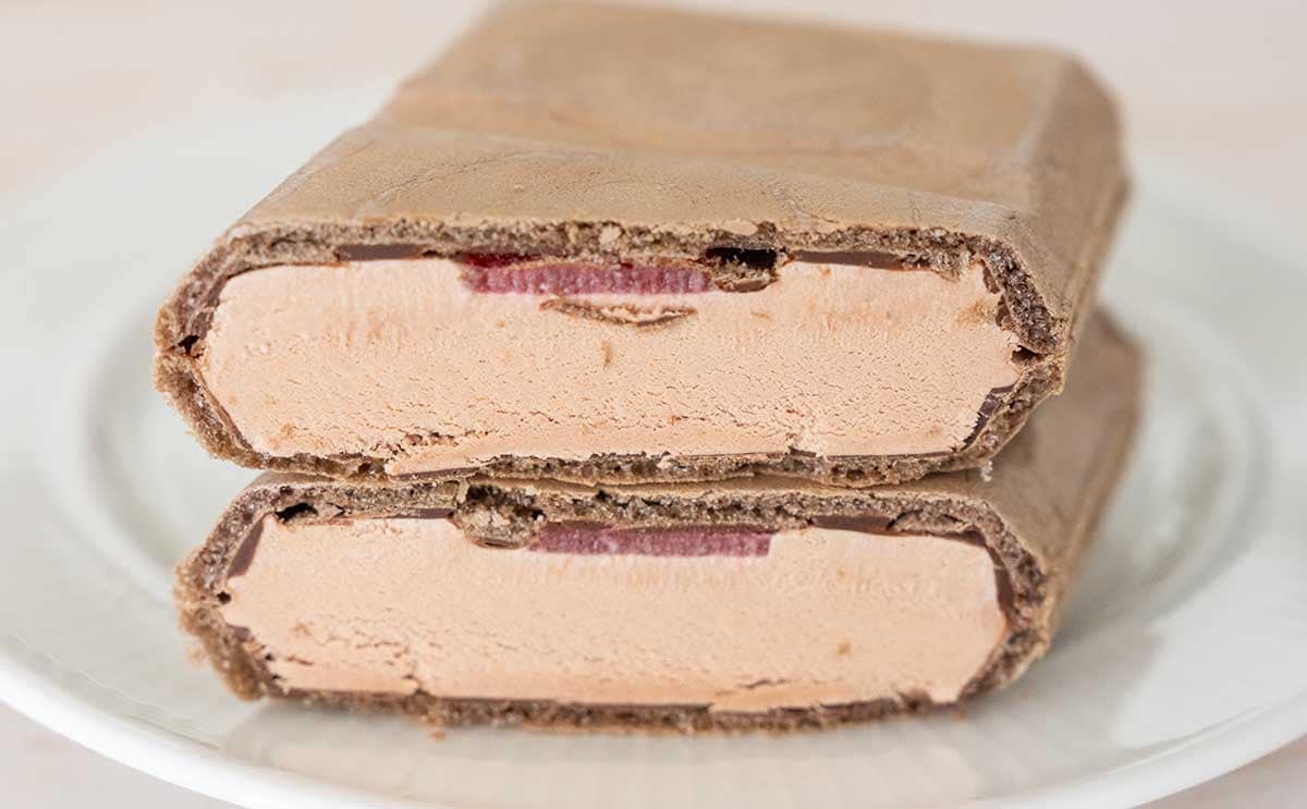 半分にカットし、中身をチェック。少しわかりづらいですが、モナカ皮とアイスの間にストロベリーソースが入っています。