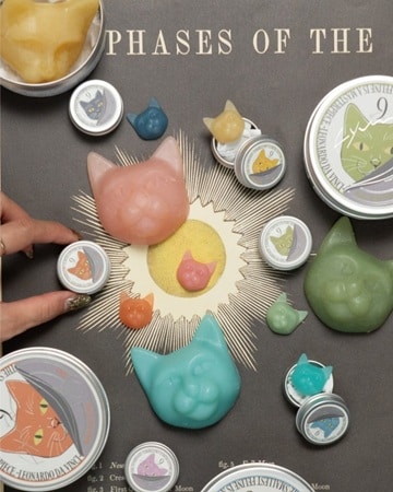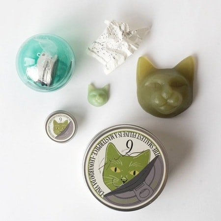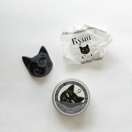 猫石鹸だけではなく中身の包み紙や、アルミ缶パッケージの細部まで丁寧に作り込まれたクオリティ。