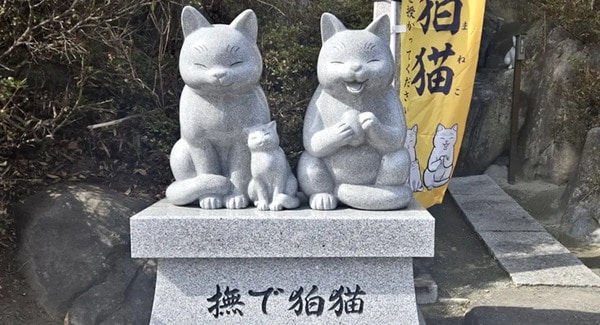 境内にある「なで狛猫」にも注目。「なで狛猫」はXで人気の漫画家・湯浅みき氏のイラストよりデザインされており、口を開けた、蚕の繭(まゆ)を大切に抱えたお父さん猫と、口を閉じた、お母さん猫と寄り添う子どもを表している。