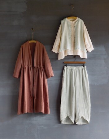 「リネンボイルパレットギャザーブラウス」35,200円(税込)と「リネンボイルパレットチュニック 」39,600円(税込) は、さくらいろ、さんごいろ、ねずみいろを展開。「リネンパレットローブワンピース」46,200円(税込) 、「リネンパレットベスト」27,500円(税込)、「リネンパレットコクーンパンツ」35,200円(税込) は、はいあかというカラーのみで展開される。