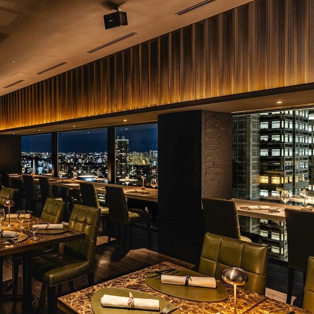 レストランが位置するのは、ホテル本館最上階の25階。ワインセラーが並ぶラグジュアリーな雰囲気の廊下を抜けると、都庁をはじめとする西新宿の夜景が目の前に。一面の大きな窓の向こうに高層ビル群の明かりがきらめき、迫力ある夜景が楽しめる。