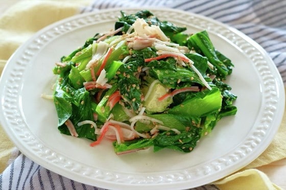 全体の調理時間は5〜7分くらい。小松菜をキッチンばさみで切れば、包丁とまな板を使わなくても作れます。 ほんのり甘みのある味のごまマヨネーズが小松菜の苦みを消してくれて、とても食べやすいサラダです。カニカマのうまみが食欲を刺激して、どんどん食べられますね。