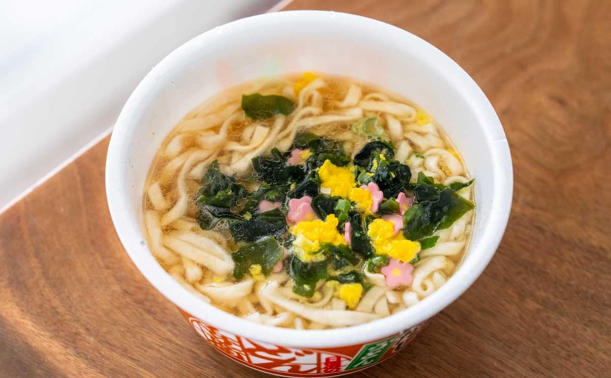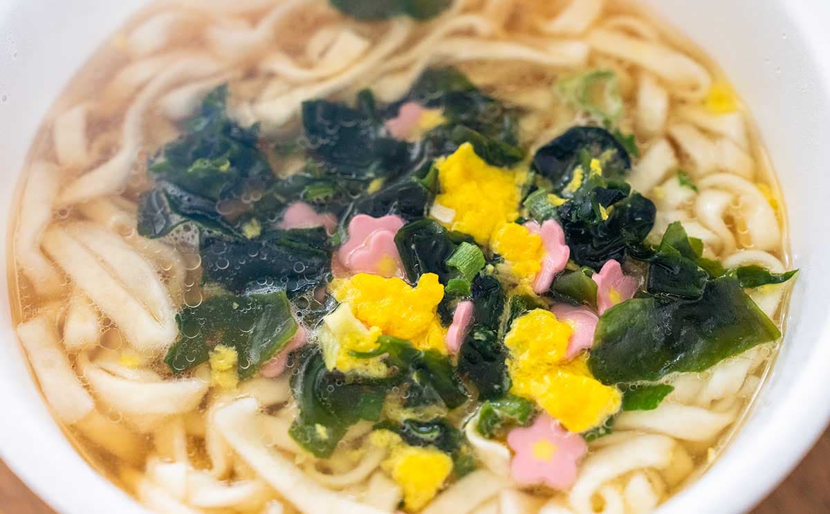 具材は、花形かまぼことかきたま、ワカメ、ネギの4種類です。