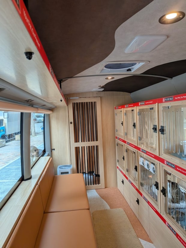 バスは二重扉構造を採用し、脱走防止に配慮。車内にはソファーを備えており、猫と人が落ち着いて触れ合える空間とした。猫にうれしいキャットウォークも設けている。