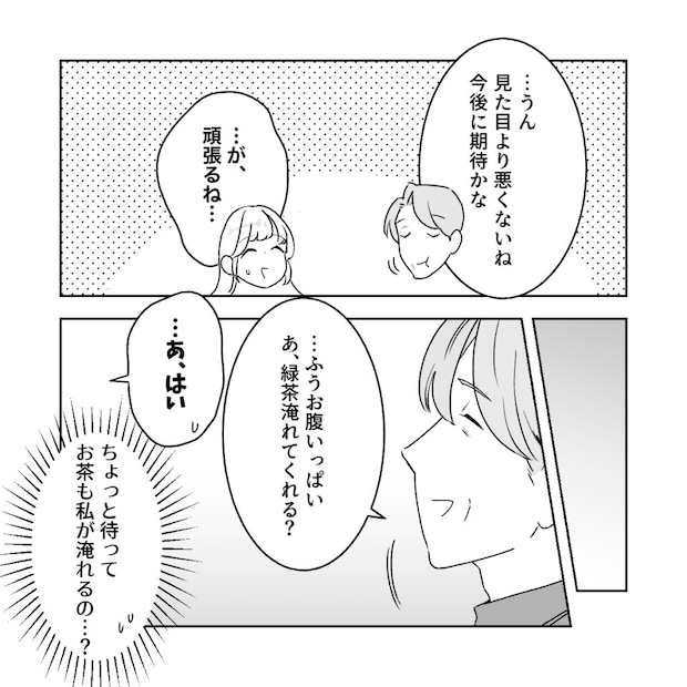 「・・ふうお腹いっぱい。あ、緑茶淹れてくれる?」と動こうともしない和男さん。「あ、はい」と答えたものの、「ちょっと待って。お茶も私が淹れるの・・?」これまでとあまりに違う和男さんの態度に驚く私。