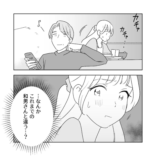 その後も、食べ終わった後の食器を片づけたり、洗ったりと忙しく動く私には目もくれず、ゆったりとソファで寛ぐ和男さん。その姿を見て、「・・なんか、これまでの和男さんと違う・・?」とあまりの違いに早くも不安になって来たのでした。
