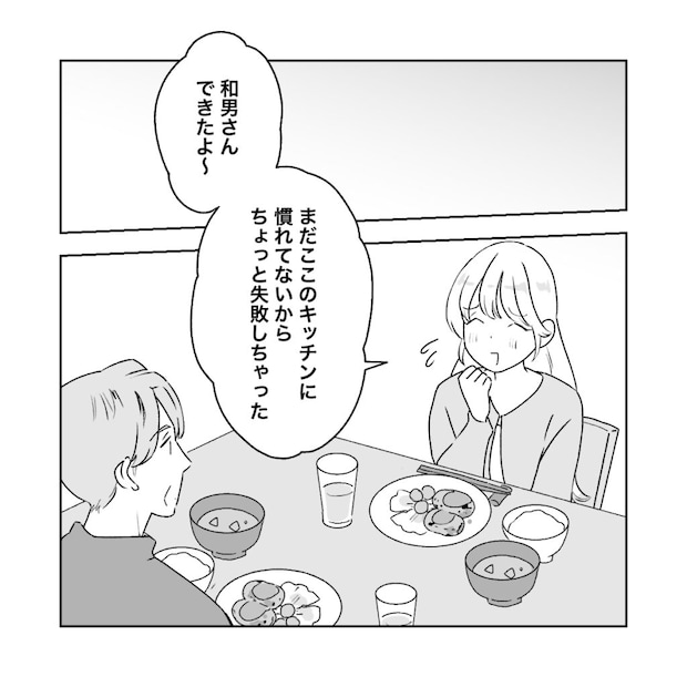 「和男さんできたよ~。まだここのキッチンに慣れてないから失敗しちゃった」そう言ってテーブルにつくと、