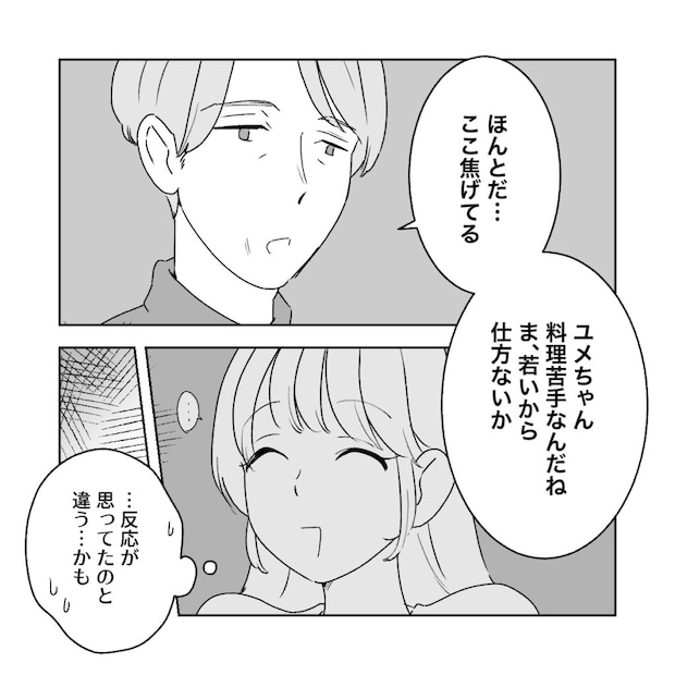 「ほんとだ・・ここ焦げてる。ユメちゃん料理苦手なんだね。ま、若いから仕方ないか」和男さんの冷たい言葉に「・・反応が思ってたのと違う・・かも(汗)」と違和感が募りました。