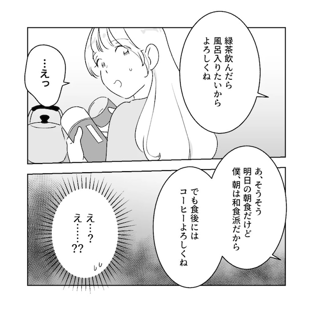 その後も、「緑茶飲んだら風呂入りたいからよろしくね」と平然と言ったり、かと思えば「あ、そうそう。明日の朝食だけど僕、朝は和食派だから。でも食後にはコーヒーよろしくね」次から次へと自分の要望を伝えてくる和男さんに、「え・・?え・・??」と驚きが止まりませんでした。