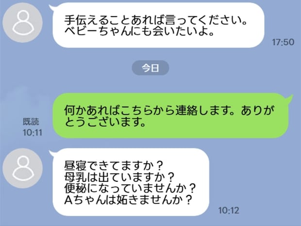 パートナーの親との関係性で悩むことはありませんか。この記事では、産後に届いた義母からのLINE攻撃に悩んでいるといった投稿を紹介します。2人目を出産し、1か月が経ったころ、義母から産後の様子を気遣うLINEが届いたという投稿者さん。当たり障りなく返事をしたところ、今度は怒涛の質問攻めにあって…。