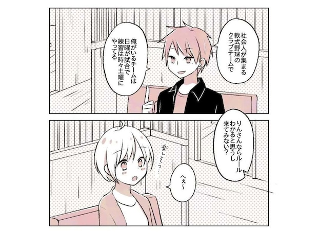 ゆーさんがわかりやすく「草野球」について教えてくれ、感心したようにあいづちを打つりんさん。そんなりんさんに「マネージャー」をしてほしいとゆーさんは言いました。