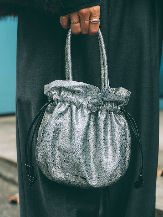 シルバーの巾着バッグで、暗くなりがちな冬コーデに華やかさをプラス。小物使いで完成度をぐっと引き上げるテクニックはお見事!