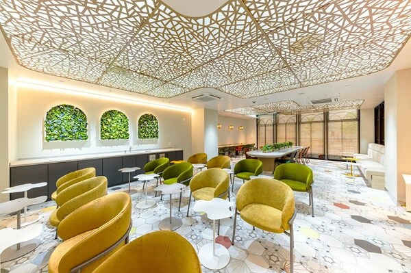 4つ目は、ガーデンのような演出を施したカフェラウンジ。同施設には、健診後にゆったり過ごせるカフェラウンジが併設されている。心身を落ち着け、次のアクションへと気持ちを整える場として機能する。