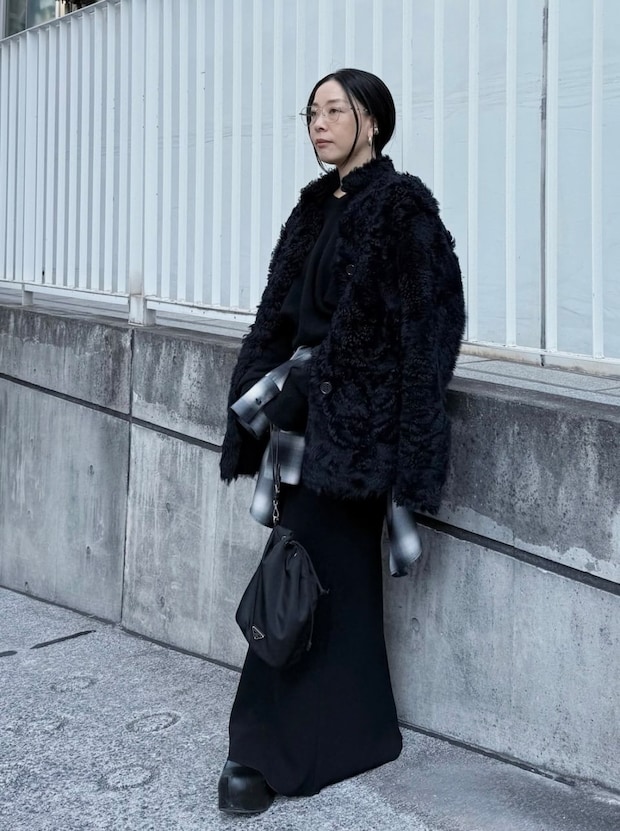 ナイロンのさり気ないツヤ感や、ファーのボリュームが印象的なブラックコーデ。シャツを腰に巻くことで、メリハリのある着こなしに! 小物にシルバーを合わせるのもヌケ感が出てオススメです。