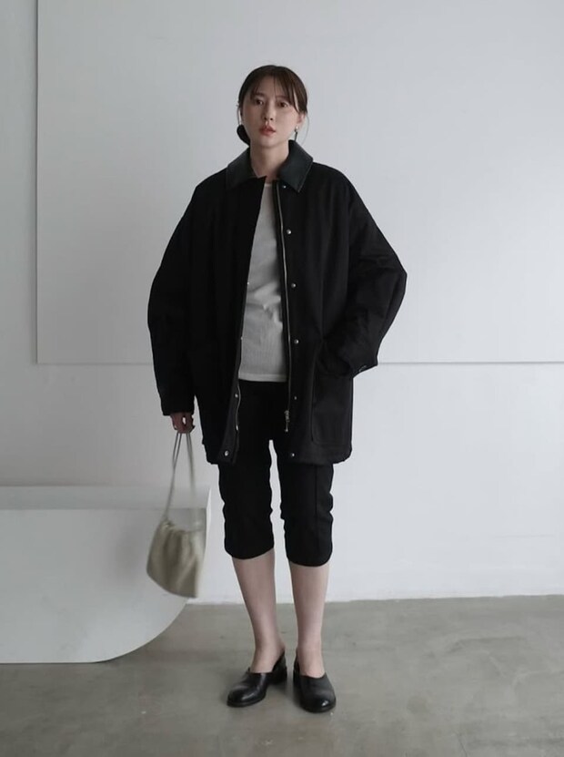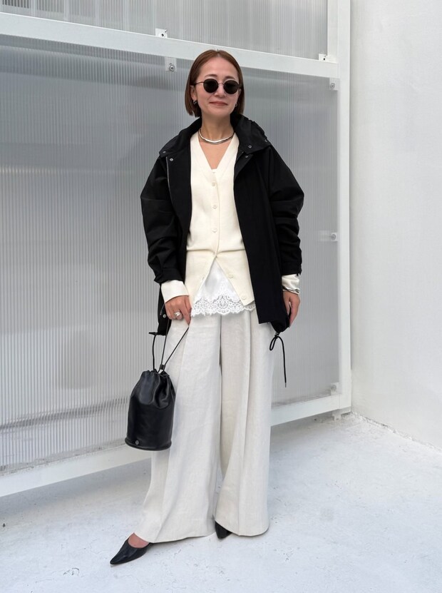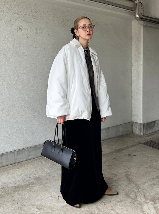 ブラックをベースに、オーバーサイズの白いダウンを羽織ったモノトーンコーデ。ボリュームのあるダウンですが、ホワイトのチョイスなら軽やかにまとまります。