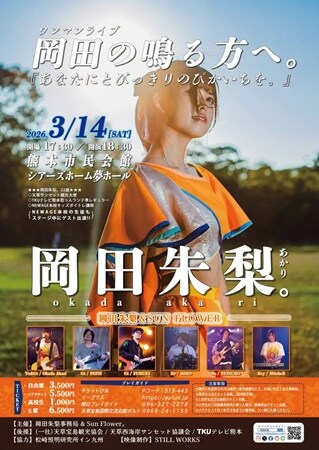 熊本県天草市出身のシンガーソングライター岡田朱梨さんが、2ndアルバム『おまもり。』のリリースを記念して、3月14日(土)、熊本市民会館シアーズホーム夢ホールにて、自身にとって最大規模となるワンマンライブ「岡田の鳴る方へ。~あなたにとびっきりのぴかいちを。~」を開催する。