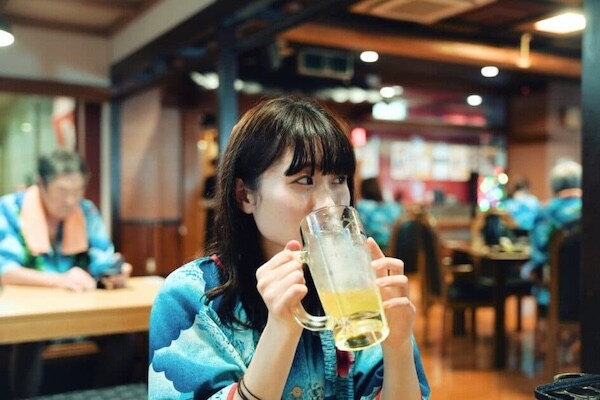 お風呂から上がったら、まずは一杯。もちろん、オロナミンC×ポカリの“オロポ”で乾杯だ。キンと冷えた炭酸が、火照った身体に気持ちいい。
