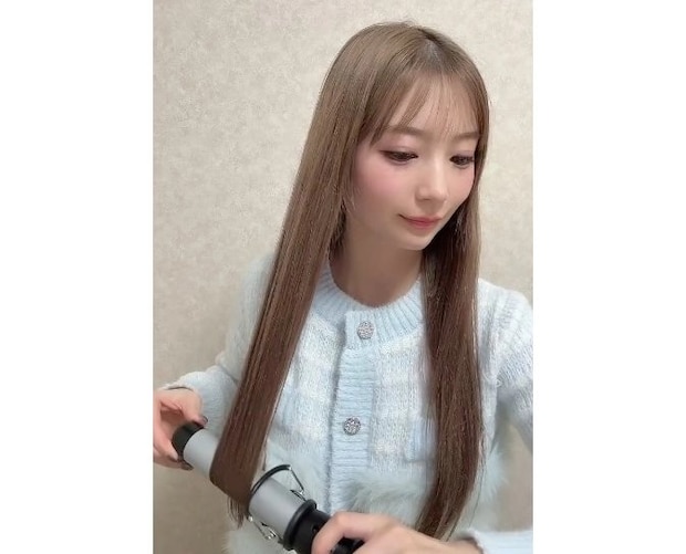 先ほど②で分けたうちの1つの毛束をとって、毛先だけワンカール内巻きにしていきます。