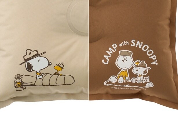寝袋と合わせて使いたいのが「SNOOPY セルフインフレート まくら-BF」(2880円)。バルブをひねると自動で空気が入る仕様で、使わないときは収納袋へコンパクトにしまっておくといい。カラーもシュラフとリンクしていて、ベージュ面にはスヌーピーとウッドストック、ブラウン面にはチャーリー・ブラウンとスヌーピーと、気分によって好きな絵柄を楽しむことができる。