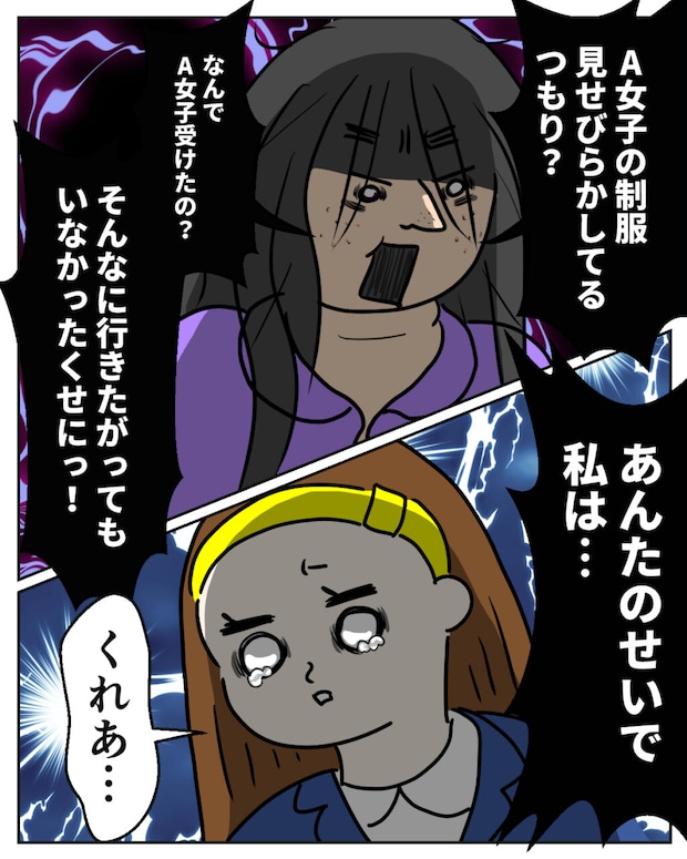 くれあは愛花を鋭い目つきでにらみつけると、「A女子の制服見せびらかしてるつもり?なんでA女子受けたの?そんなに行きたがってもいなかったくせに!あんたのせいで私は・・・」と愛花を激しく責め立てます。その言葉を聞いた愛花は、今にも泣き出しそうな表情を浮かべました。