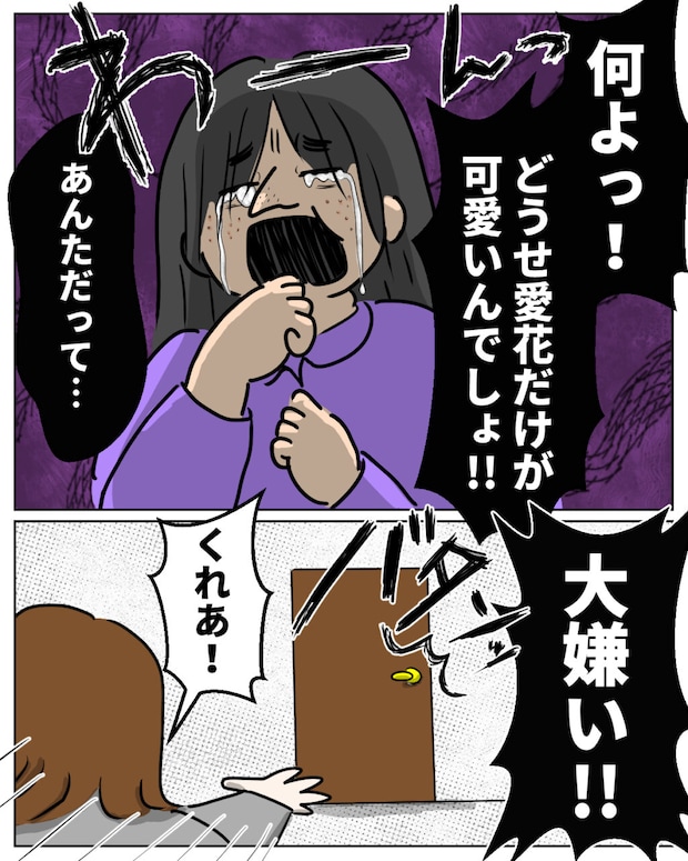 くれあは声をあげて泣きながら、「何よっ!どうせ愛花だけが可愛いんでしょ!あんただって大嫌い!」そう吐き捨てると、再び部屋に閉じこもってしまいました。