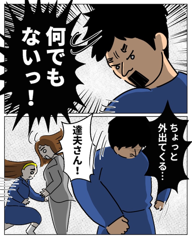 目に飛び込んできた光景に驚いた私は、思わず「2人とも、どうしたの!?」と大きな声をあげました。すると達夫さんは「何でもないっ!」と声を荒らげ、「ちょっと外に出てくる」と言い残して部屋を出て行ってしまいました。愛花は慌てて、うずくまるくれあのもとに駆け寄ります。