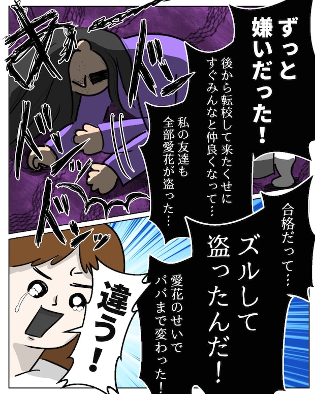 しかし、くれあは止まりません。床をドンドンと叩きながら、「ずっと嫌いだった!後から転校して来たくせにすぐみんなと仲良くなって、私の友達も全部愛花が盗った・・・合格だってズルして盗ったんだ!愛花のせいでパパまで変わった!」と今まで溜め込んでいた不満を一気に吐き出しました。私は思わず「違う!」と大きな声をあげます。