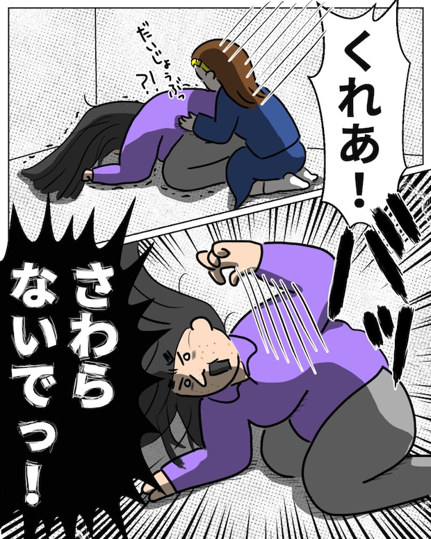 私も達夫さんも、部屋から出てこないくれあのことで手一杯になり、愛花の気持ちにまで目を向ける余裕がありませんでした。本当は、学校や部活、新しくできた友達の話をたくさんしたかったはずなのに、くれあを気遣ってずっと我慢していたのでしょう。久しぶりに2人で話せて、愛花はとても嬉しそうでした。久々のお出かけを楽しみ、家に戻った私たち。すると、そこには頭を抱えてうずくまるくれあと、その前に仁王立ちする達夫さんの姿があったのです。