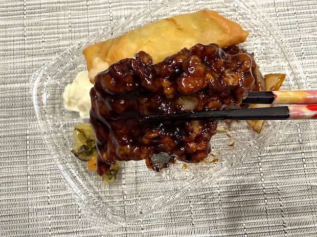 最初にご紹介するのが、具材が大きくカットされボリュームがある「ごろっと大きな肉と野菜 黒酢酢豚&春巻弁当」です。