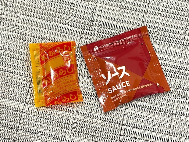 別袋でからしとソースが付いており、お好みに合わせて使用可能。途中で加えれば、風味に変化が生まれて最後まで飽きずに楽しめますよ♪