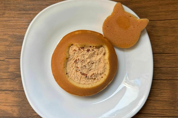 猫の形に抜いたどら焼き生地に、キャラメルホイップとソース、そして食感の良いカラメルチップをサンドした生どら焼きです。