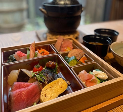 「蔵代醗彩」のランチには、彩り豊かな「醗彩松花堂ボックス(季節の発酵小鉢、旬魚の麹焼き、土鍋炊きご飯、特製味噌汁2種付き)」¥4,180(税込)が登場。蔵代味噌から仕入れる全国の味噌を料理ごとに使い分けるのはもちろん、自家製の醤(ひしお)や麹で旨みを引き出した焼き物など、多彩な発酵食材を少しずつ贅沢に詰め合わせている。蓋を開ける瞬間のときめきを閉じ込めた、目にも鮮やかなランチ限定ボックスだ。
