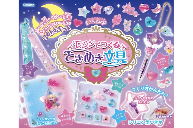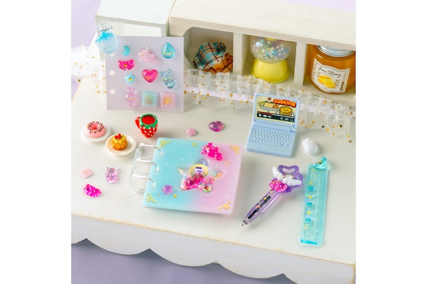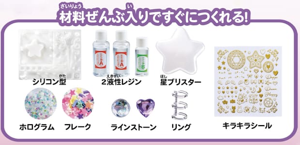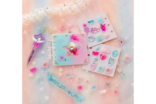 SNS総フォロワー110万人を誇る大人気ハンドメイド作家・むぎまま氏が全面的にプロデュースしています。UVライトが不要な2液性レジンを採用しているので、材料を混ぜてシリコン型に流し込むだけで、初心者でも安全かつ簡単に透明感あふれるキラキラとした文具を制作できます。