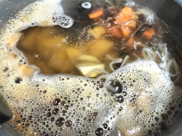 2. 沸騰したらにんじん、きくらげ、糸こんにゃくを加え中火にします。