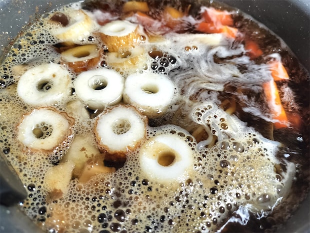 3. にんじんがやわらかくなったら里芋を加え、やわらかくなるまで煮ます。