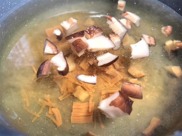 1. 鍋に干し貝柱と戻し汁、干ししいたけと戻し汁、かつおだし汁を入れて強火で沸騰させます。