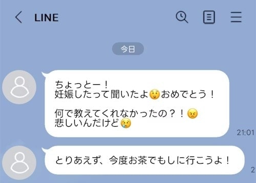 たまにしか会わない友達が私の妊娠を又聞きしたみたいで、何で言ってくれなかったの?ってちょっとだけ怒ってる風にLINEが来てしまいました😭