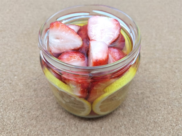 いつものごとくニッカウヰスキー公式さんは細かなレシピを書いていないので、買ってきたいちごの重さを量るところから始めました。このいちごが全部入って、かつレモンとウイスキーがちょうどいい感じに入る大きさの瓶が必要なのですが、なんとぴったりの瓶がありました。まるでこのレシピを待っていたかのようです。今回用意したいちごが150gでしたので、砂糖は約1/5の30gにしました。レモンスライスを入れてウイスキーを量りながら入れると、ちょうど100mlでいい感じになりました。フタをしてそのまま、日が当たらないところに保管。4日後が楽しみですね。