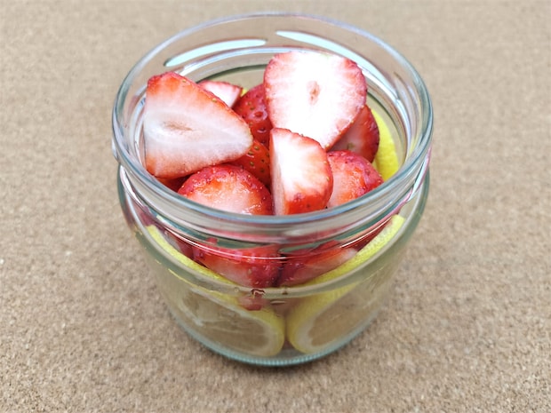 1.漬込み用の瓶にいちごと輪切りレモンを入れます。
