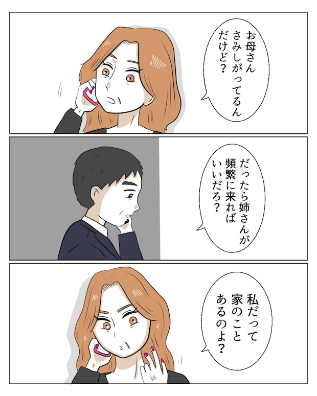 「お母さん、さみしがってるんだけど?」そう詰め寄るエミさんに、和也さんは落ち着いた口調で、「だったら姉さんが頻繁に来ればいいだろ?」と返しました。しかしエミさんは、私が来ていないこと自体が気に入らない様子で、「私だって家のことがあるのよ?」と不満をぶつけます。家のことがあっても、本当に義母のことを思っているなら毎日お見舞いに来られるはず、とでも言いたいのでしょうか。