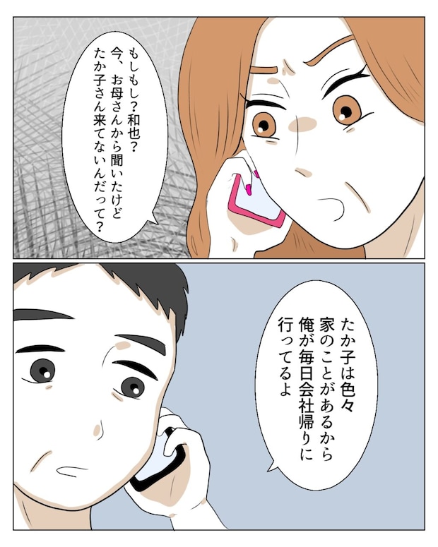 「もしもし和也?お母さんから聞いたけど、たか子さん来てないんだって?」怒りをにじませた表情で、エミさんはそう切り出しました。和也さんは、「たか子は色々家のことがあるから、俺が毎日会社帰りに行ってるよ」と、さりげなく私をかばってくれます。