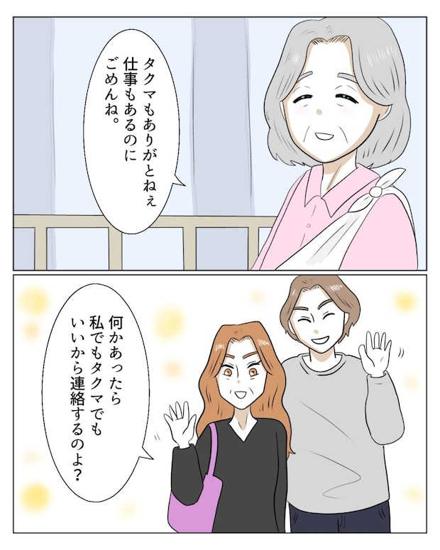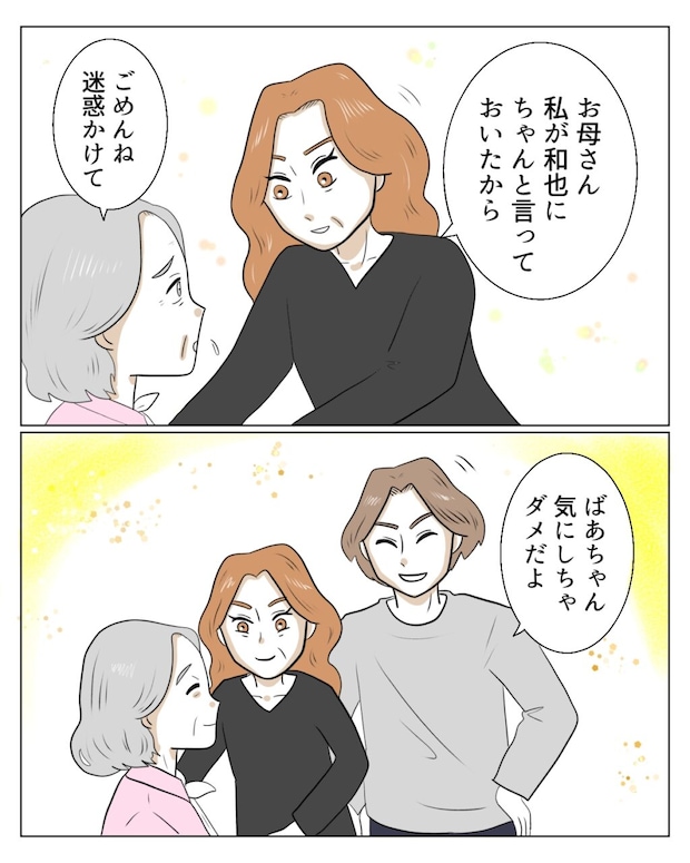 エミさんは義母のほうに向き直ると、「お母さん、私が和也にちゃんと言っておいたから」と誇らしげな顔で言いました。それを聞いた義母は、「ごめんね、迷惑かけて」と申し訳なさそうな表情。するとタクマくんも、「ばあちゃん、気にしちゃダメだよ」と優しく声をかけます。2人から労わられ、義母は満足そうに微笑みました。