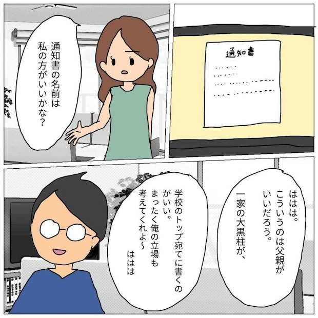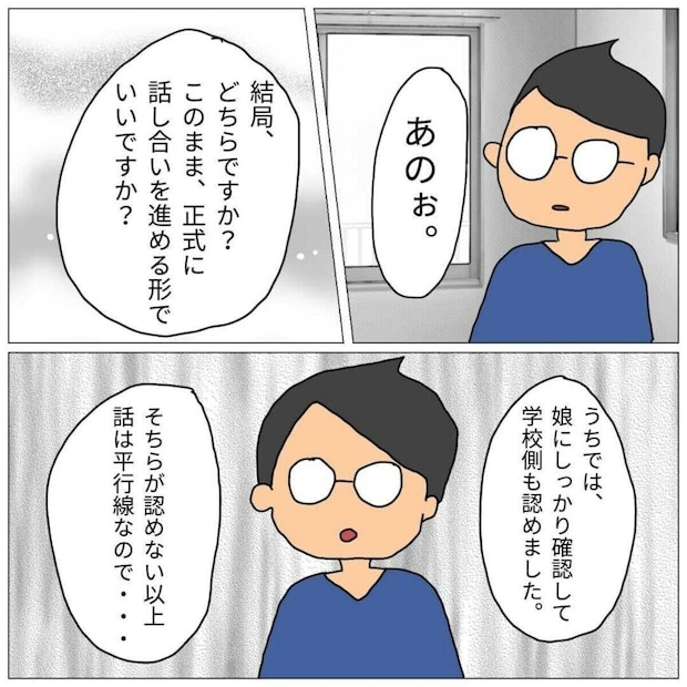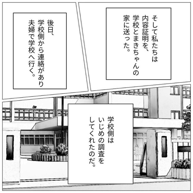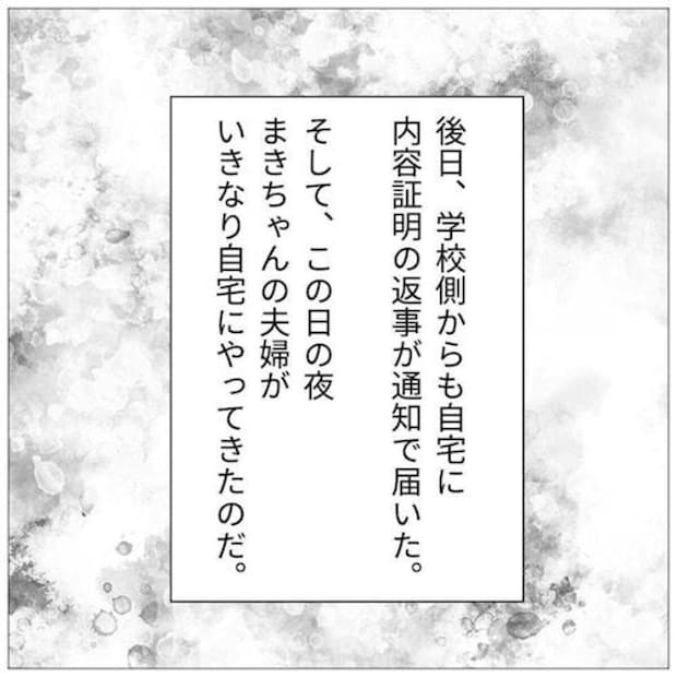 相談をすると「内容証明を送ってみるか」と冷静な判断をするパパ。送付すると学校はいじめの調査をして内容証明を返信してくれましたが、ときを同じくして怒鳴りこんでくるまきちゃんのママパパ。しかしパパは毅然(きぜん)とした態度で立ち向かいます。