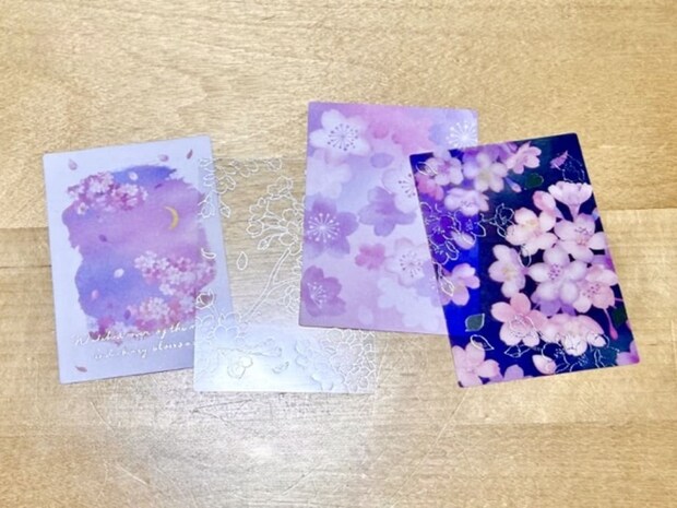 筆者が購入したのは、夜桜のイラストがあしらわれた風景画のようなシート、シルバーの桜、紫を基調とした桜のイラスト、そして夜桜がプリントされたクリアシートの4種がセットになったBタイプ。