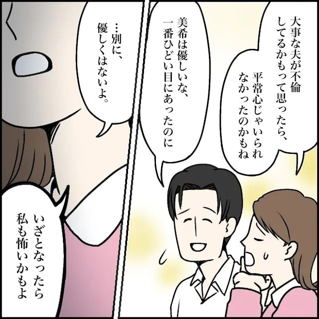 私だってなぜ自分が疑われたのか不思議で仕方がありませんが、無理やり玲美さんの気持ちを理解してみようとしてみて「大事な夫が不倫してるかもって思ったら、平常心じゃいられなかったのかもね」と共感の言葉を絞り出しました。「美希は優しいな、一番ひどい目にあったのに」と言う太一。私は「・・別に優しくはないよ。いざとなったら私も怖いかもよ」と呟きました。