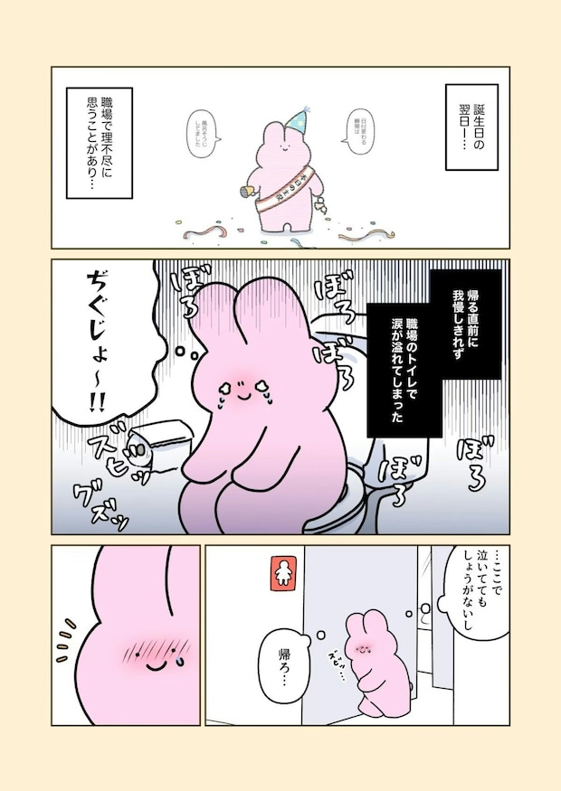物語は、誕生日の翌日から始まります。職場で理不尽に感じるでき事があり、気持ちを引きずったまま一日を終えようとしていたジョセフィーナゆきさん。帰る直前、職場のトイレで思わず涙がこぼれてしまったそうです…。しかし思わぬ展開に。話題の投稿がこちらです。